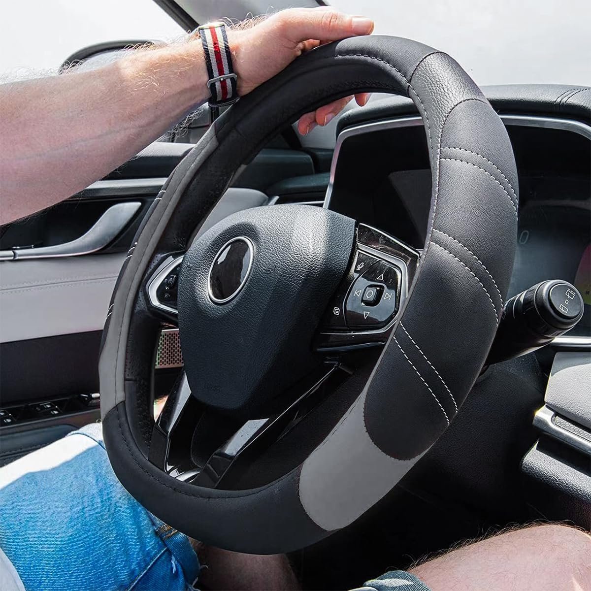 - 【Improved Grip】: Safety is top priority, and this leather steering wheel cover stands out in this regard. The textured surface of the leather, combined with its elasticity, provides excellent grip, even in adverse conditions. If your hands are sweating on a hot day or wet by the rain, the friction of the material ensures that your fingers sit firmly on the steering wheel.